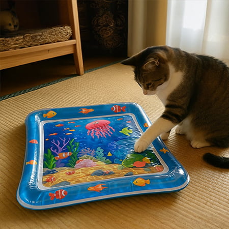 Ideal for keeping cats cool in hot weather while reducing stress. The soothing water movement and textured surface provide mental engagement and interactive bonding opportunities.The colorful sea-themed sensory cat water play mat is more attractive for cats to play on.